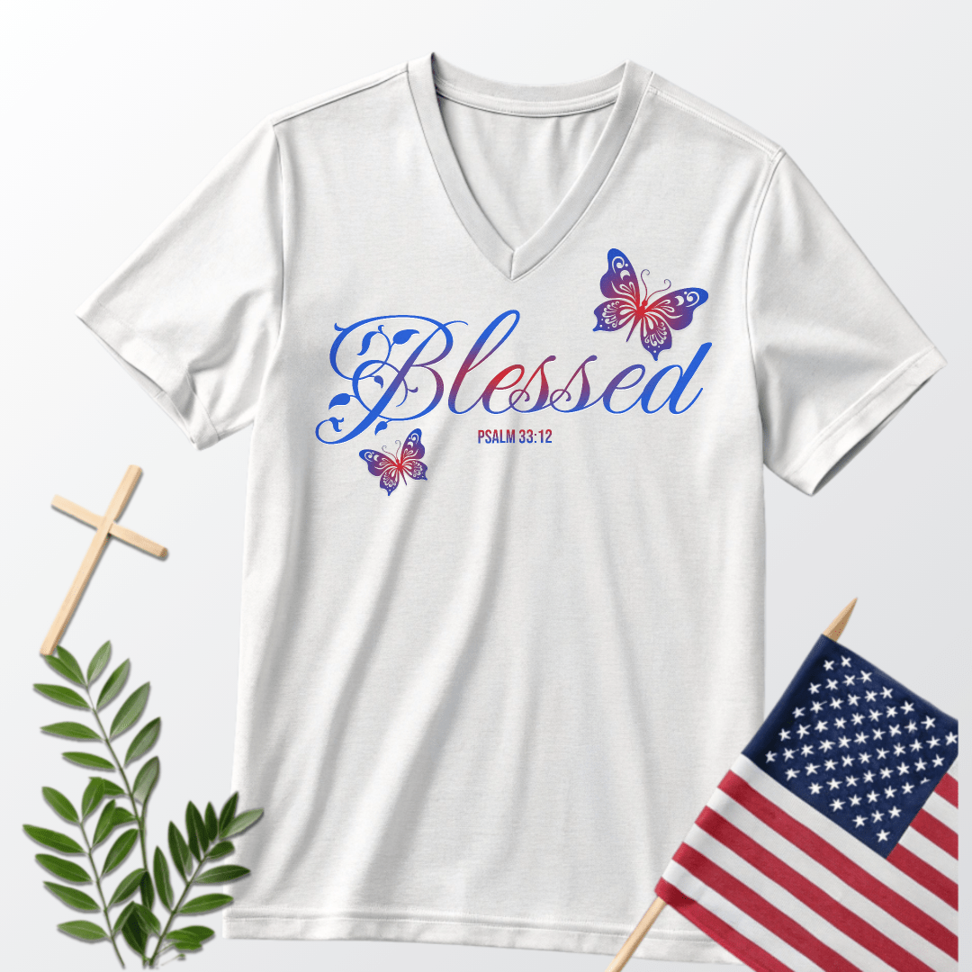 Show your faith and love for freedom with this beautifully designed "Blessed" t-shirt. Featuring an elegant script with red, white, and blue tones, this design is accented by two delicate butterflies that reflect both spiritual grace and patriotic pride. Below the word "Blessed," the powerful verse Psalm 33:12 reminds us: "Blessed is the nation whose God is the Lord."