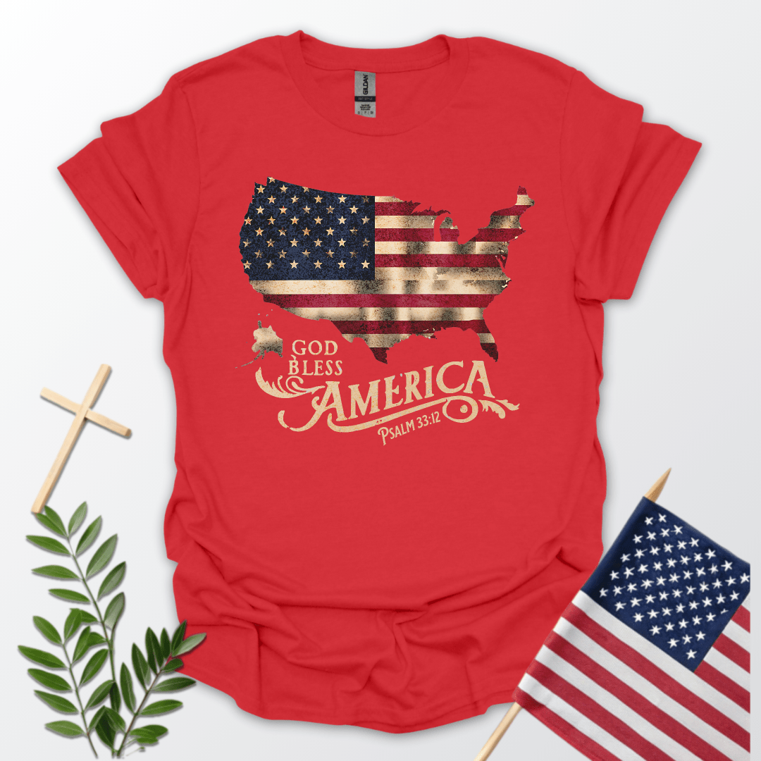 Celebrate your faith and patriotism with our "God Bless America" T-shirt, inspired by Psalm 33:12. This vibrant tee features a striking design of the United States map, beautifully overlaid with the iconic stars and stripes of the American flag. The heartfelt message "God Bless America" is prominently displayed, reminding us of the divine favor bestowed upon our nation, as captured in the scripture: "Blessed is the nation whose God is the Lord."